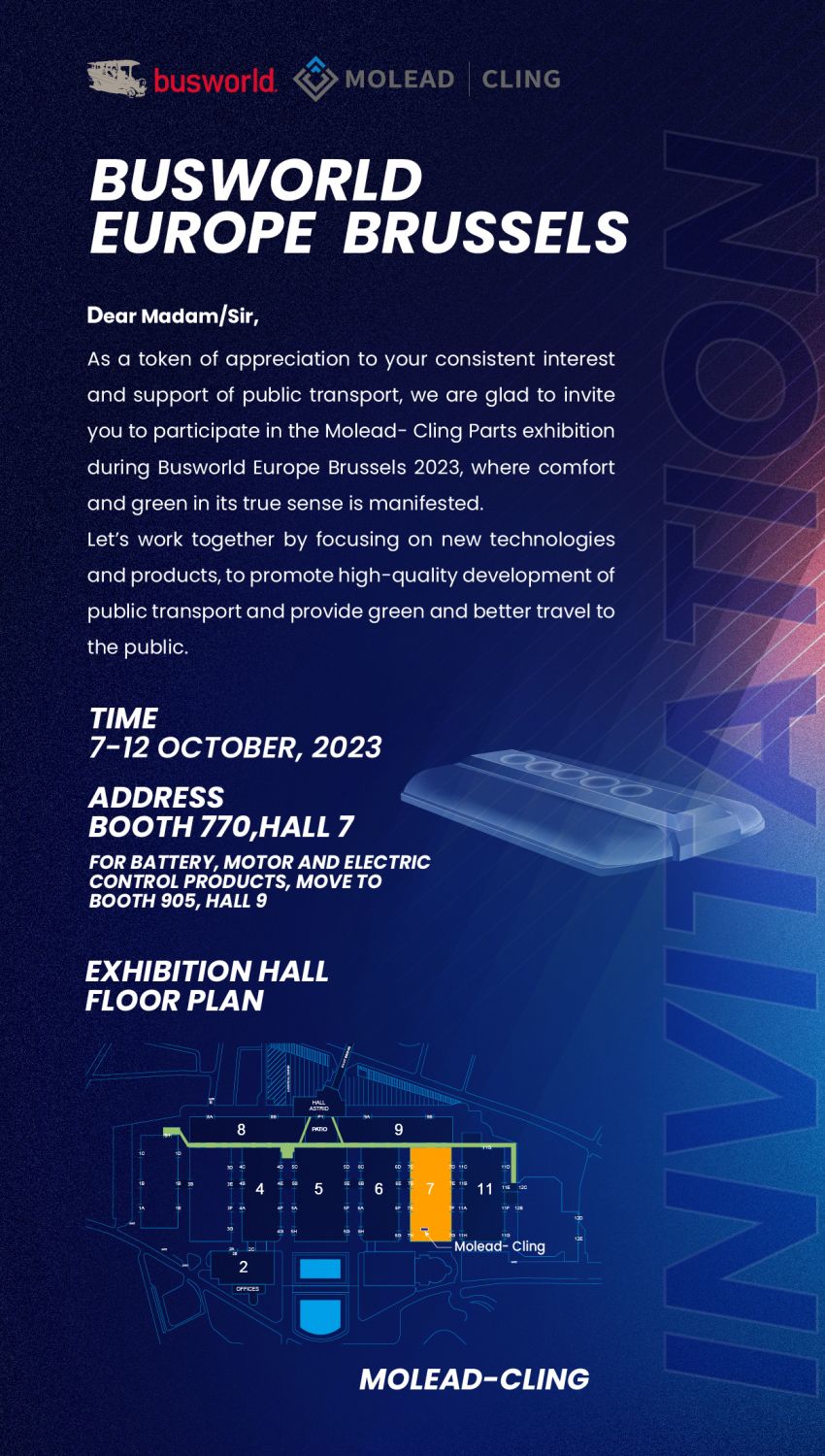 As a taken of appreciation to your consistent interest and and support of public transport, we are glad to invite you to participate in the Molead-Cling Parts exhibition during Busworld Europe Brussels 2023, where comfort  and green in its true sense is manifested.